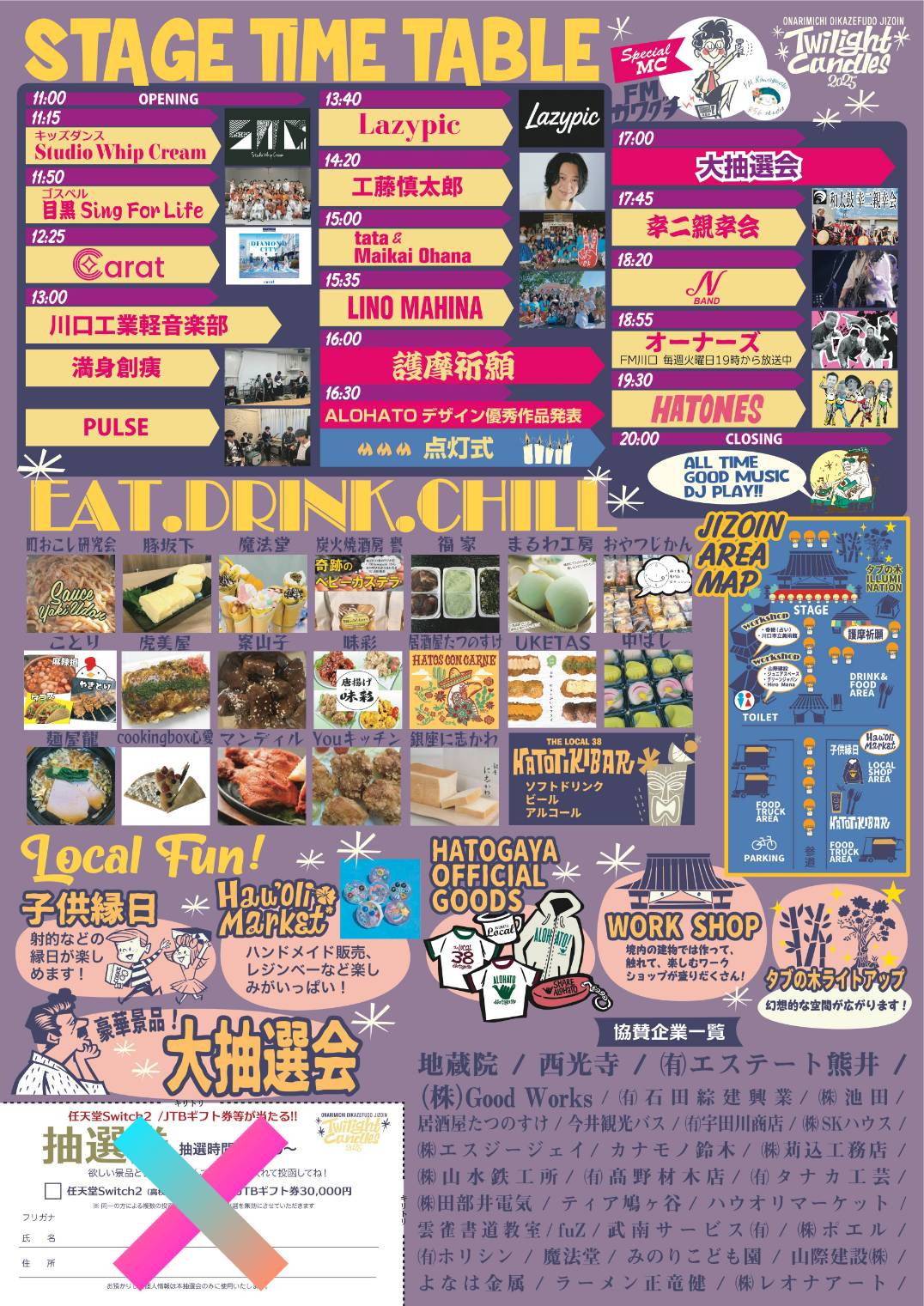 境内に作られた特設ステージでは地域で活躍する団体によるフラダンスや和太鼓、大抽選会等を行い、参道ではキッチンカーを中心に飲食店、縁日、ワークショップ等を展開。